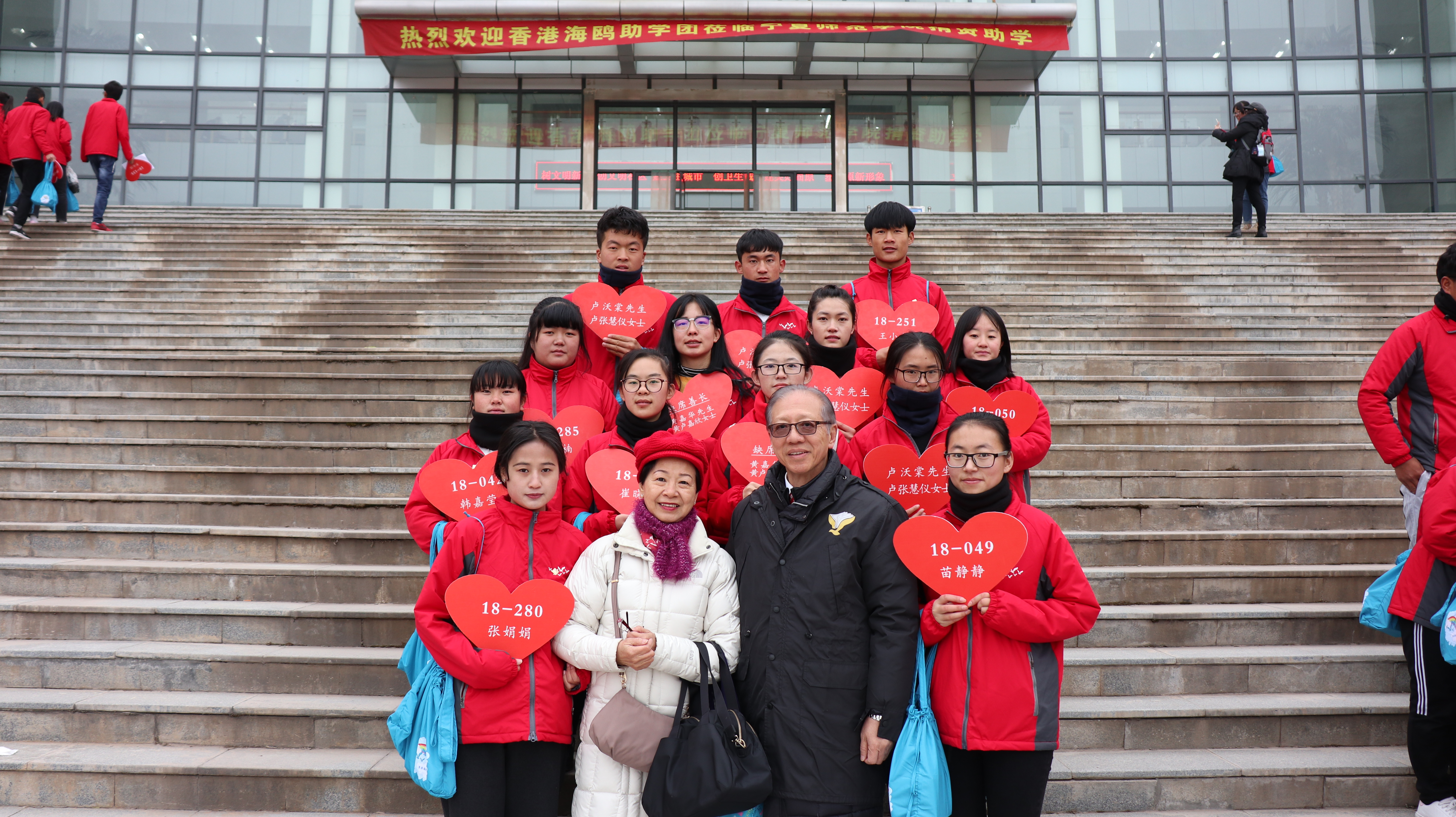 19.11.01-07   七天,香港海鷗助學團到甘肅蘭州助學,本基金撥款人民幣12萬元贊助12位清貧大學生。賴國明、黃壽良、黃錫雄親到現場與受助學生見面。